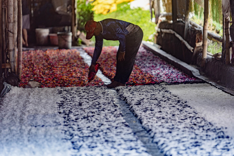 作为印尼重要的蜡染产地,河岸晾布仍是当地最常见的生产场景之一。工人们表示,尽管现代设备能加快干燥过程,但自然日照所带来的纹理与色彩层次,仍然难以复制。