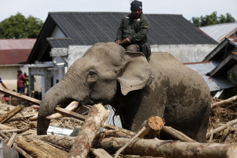 (Three Sumatran elephants participate in disaster cleanup.)