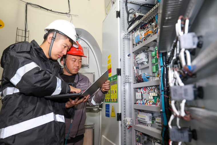 (Chinese engineers inspect turbine blades together with Lao technicians.)