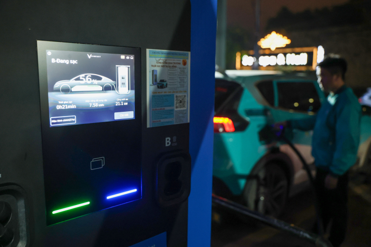 (A Vietnamese taxi driver charges an electric vehicle at a charging station.)