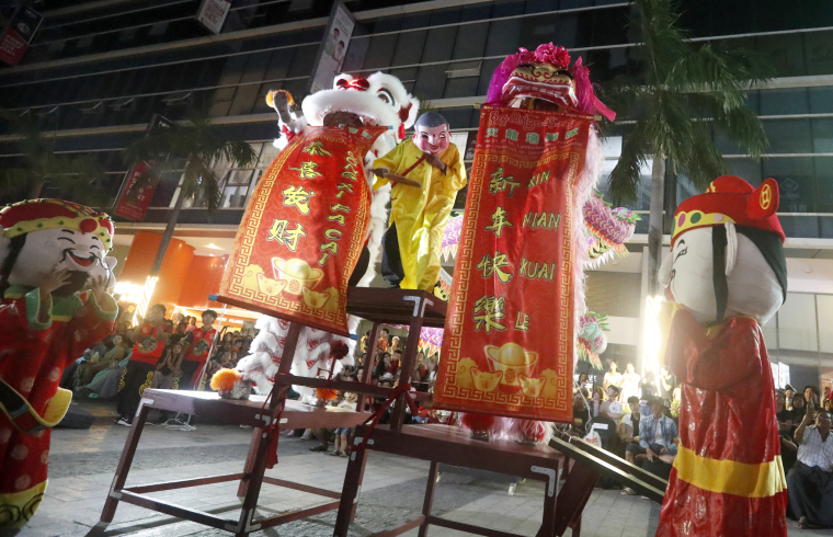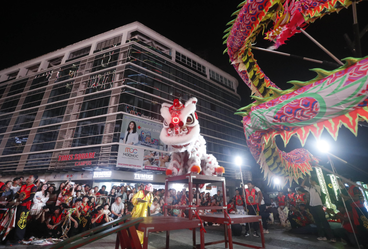 舞者在广场表演舞狮,迎接即将到来的中国农历新年
