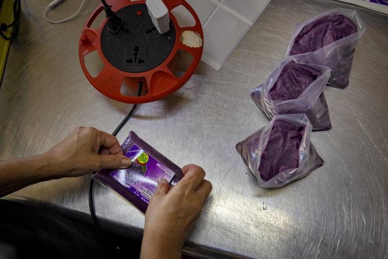 一名工人打包用紫薯做成的果酱