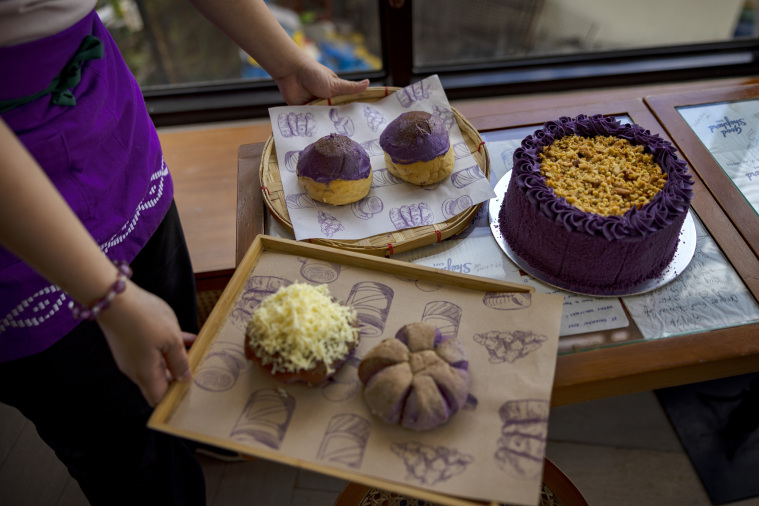 一名咖啡店的店员展示用紫薯制作的糕点