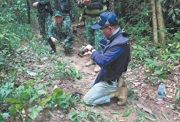 Thai army and police personnel examine a disarmed landmine in Si Sa Ket Province along the Cambodia-Thailand border on Monday. ROYAL THAI ARMY/AFP